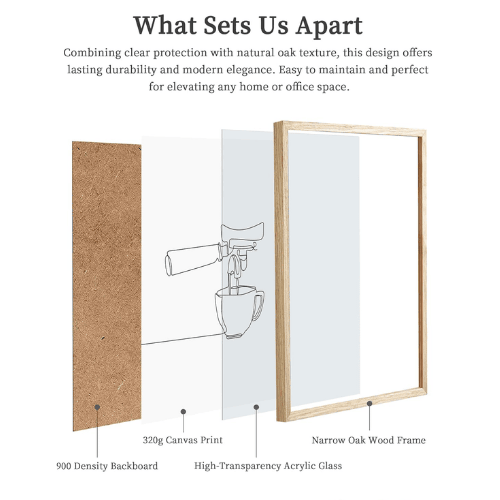 Minimalist coffee line art wall decor featuring simple cup and brewing illustrations. Printed on durable canvas, framed in premium oak wood with protective organic glass. Size 12"x16", easy to hang with removable back panel. Perfect for kitchens, dining rooms, coffee bars, or living spaces. A chic gift for coffee lovers and modern home décor.