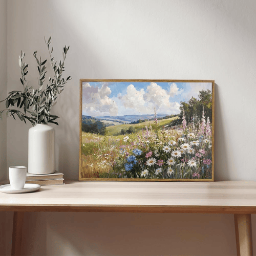Enhance your home with this framed wildflower canvas wall art, featuring daisies, cornflowers, foxgloves, and rolling hills under a serene sky. Printed with fade-resistant inks on textured canvas and set in a sturdy polymer frame, this 12×16 inch artwork brings countryside beauty into any room. Comes with hooks for wall hanging or a stand for tabletop display. Perfect for living room, bedroom, bathroom, office, or farmhouse decor, and a thoughtful gift for art or nature lovers.
